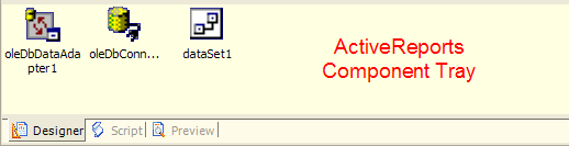 - .NET data components can now be dropped directly onto the design surface of an ActiveReport, resulting in a visual representation of the component in the new ActiveReports component tray. This makes it easy to use custom data.