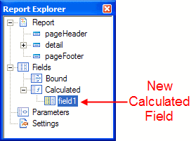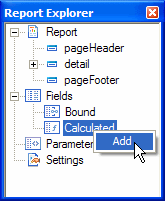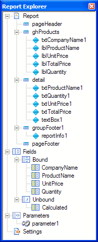 In ActiveReports for .NET 3.0 the Report Explorer serves as the information focal point for your report. From it, you can gain a quick overview of the elements that comprise the report, remove individual controls, add parameters and calculated fields, change report settings, bind data fields to textbox controls, and modify properties and report behavior via the Properties grid.