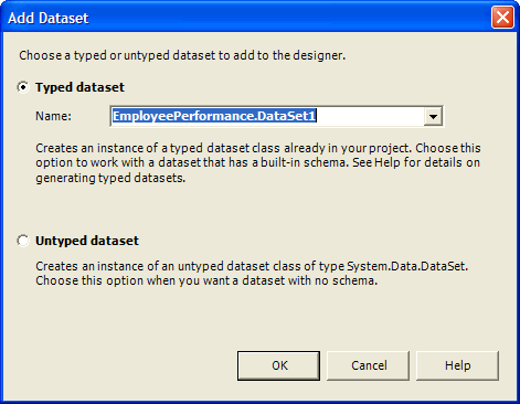 If your project already contains a dataset that you want to use within the ActiveReport designer, drag the DataSet object from the Data tab of the toolbox onto the report surface. This will open the Add Dataset dialog. To add your dataset, select the Typed dataset option then choose your dataset. |