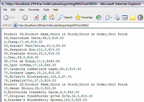 When you have completed this walkthrough, you will have a report in comma-delimited text format that looks similar to the following.