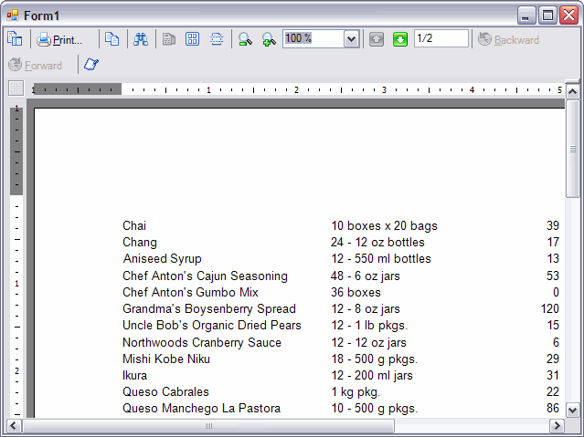 Field Text Location Size ProductName Product Name 0, 0 2.3, 0.19 QuantityPerUnit Quantity 2.38, 0 1.55, 0.19 UnitsInStock Stock 4, 0 1, 0.19 - Set the CanShrink property of the detail section to True to eliminate white space in the rendered report.