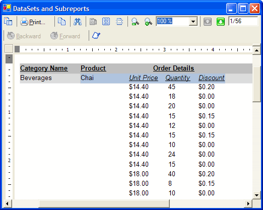 'Visual Basic Dim counter As Integer Private Sub Detail1_Format(ByVal sender As Object, ByVal e As System.EventArgs)Handles Detail1.Format Dim drc As DataRow If CType(Me.DataSource, DataSet).Tables("Categories").Rows.Count > counter Then drc = CType(Me.DataSource, DataSet).Tables("Categories").Rows(counter) counter = counter + 1 End If Dim rpt As New rptProductsSub() rpt.DataSource = drc.GetChildRows(CType(Me.DataSource, DataSet).Relations("CategoriesProducts")) Me.SubReport1.Report = rpt End Sub//C# int counter; private void detail_Format(object sender, System.EventArgs eArgs) { DataRow drc = null; if(((DataSet)this.DataSource).Tables["Categories"].Rows.Count>counter) { drc = ((DataSet)this.DataSource).Tables["Categories"] .Rows[counter]; counter++; } rptProductsSub rpt = new rptProductsSub(); rpt.DataSource = drc.GetChildRows(((DataSet)this.DataSource) .Relations["CategoriesProducts"]); this.SubReport1.Report = rpt; }