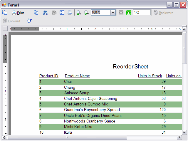 Control Name Text Formatting Location Label lblTitle Reorder Sheet Font 14pt; Bold; Center 0, 0 Label lblProductID Product ID Underline 0, 0.37 Label lblProductName Product Name Underline 0.9, 0.37 Label lblUnitsInStock Units in Stock Underline 3.5, 0.37 Label lblUnitsOnOrder Units on Order Underline 4.5, 0.37 Label lblReorderLevel Reorder Level Underline 5.6, 0.37