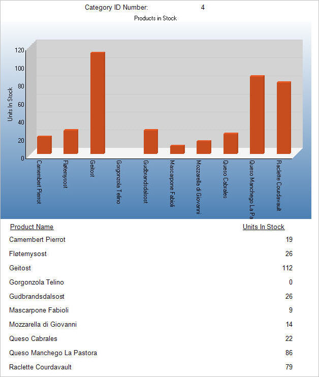 Control DataField Name Text Section Location Label lblCategoryID Category ID Number: ghCategoryID 1.78, 0 TextBox CategoryID txtCategoryID CategoryID ghCategoryID 3.72, 0 ChartControl chartControl1 ghCategoryID 0.063, 0.313 Label lblProductName Product Name ghCategoryID 0.23, 5.43 Label lblUnitsInStock Units In Stock ghCategoryID 5, 5.43 TextBox ProductName txtProductName ProductName Detail 0.23, 0 TextBox UnitsInStock txtUnitsInStock UnitsInStock Detail 5, 0.23