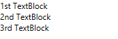 'Create a stack panel and add it to C1HeaderedContentControl Dim StackPanel1 As New StackPanel() C1HeaderedContentControl_CP.Content = (StackPanel1) 'Create three TextBlock control and set their Text properties Dim TextBlock1 As New TextBlock() Dim TextBlock2 As New TextBlock() Dim TextBlock3 As New TextBlock() TextBlock1.Text = "1st TextBlock" TextBlock2.Text = "2nd TextBlock" TextBlock3.Text = "3rd TextBlock" 'Add TextBlock controls to StackPanel StackPanel1.Children.Add(TextBlock1) StackPanel1.Children.Add(TextBlock2) StackPanel1.Children.Add(TextBlock3)