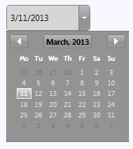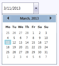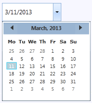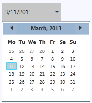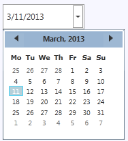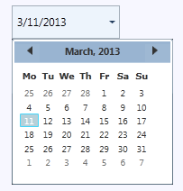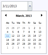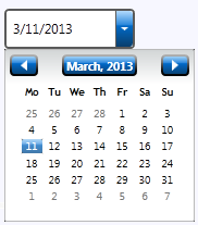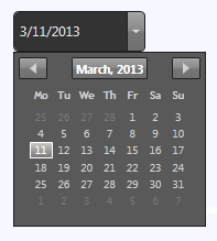 But the C1DatePicker control can also be themed with one of our thirteen included WPF themes: BureauBlack, C1Blue, ExpressionDark, ExpressionLight, Office2007Black, Office2007Blue, Office2007Silver, Office2010Black, Office2010Blue, Office2010Silver, ShinyBlue, and WhistlerBlue. The table below provides a sample of each theme: