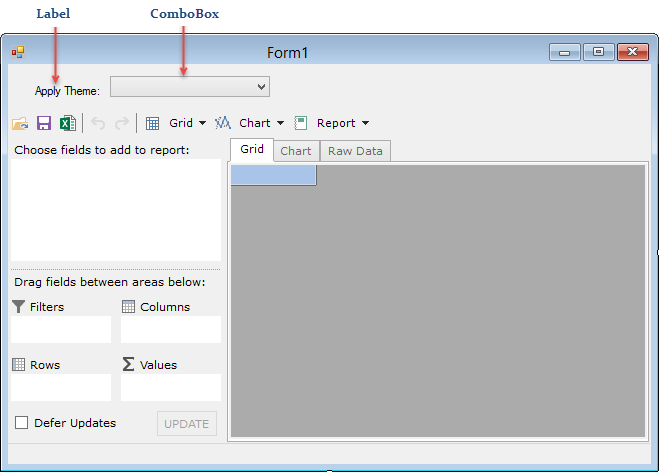 Private Sub cbTheme_SelectedIndexChanged(sender As Object, e As EventArgs) Dim theme As C1Theme = C1ThemeController.GetThemeByName(cbTheme.Text, False) If theme IsNot Nothing Then C1ThemeController.ApplyThemeToObject(c1FlexPivotPage1, theme) End If End Sub
