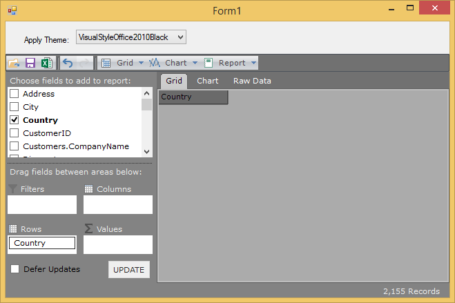 // get data var da = new OleDbDataAdapter("Select * from Invoices", GetConnectionString()); var dt = new DataTable("NorthWind Sales Data"); da.Fill(dt); // assign data to C1FlexPivotPage control c1FlexPivotPage1.DataSource = dt; var fp = c1FlexPivotPage1.FlexPivotEngine; fp.ValueFields.MaxItems = 3; fp.BeginUpdate(); fp.RowFields.Add("Country"); fp.ColumnFields.Add("Product"); fp.ValueFields.Add("Sales"); fp.EndUpdate();