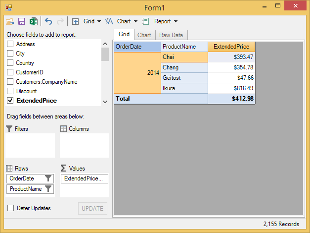 ' format order date and extended price Dim field = fp.Fields("OrderDate") field.Format = "yyyy" field = fp.Fields("ExtendedPrice") field.Format = "c" ' show average price (instead of sum) field = fp.Fields("ExtendedPrice") field.Subtotal = C1.FlexPivot.Subtotal.Average