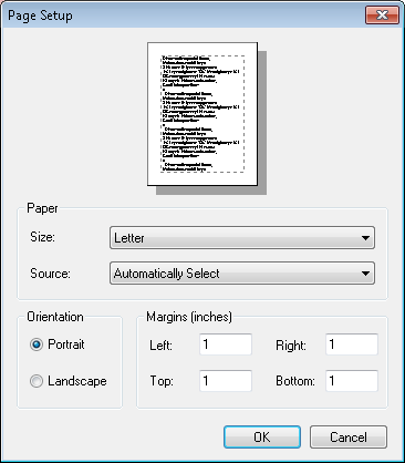 The Page Setup dialog is used for selecting the paper size and paper source to be used as well as the orientation and margin.