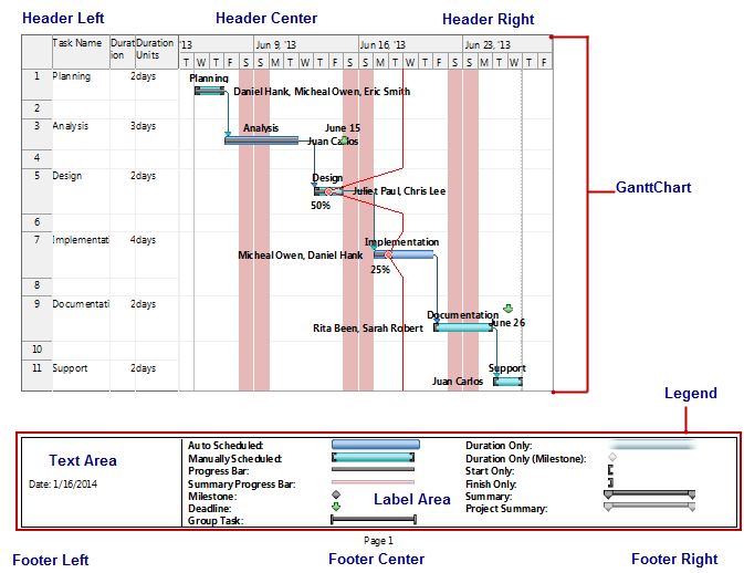 Header/Footer - Divides the GanttView into three parts. Each part represents a column. You can add content and format it for each part.