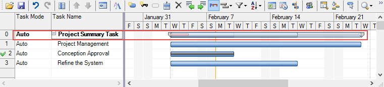 You can represent multiple tasks on the Project Summary Task bar by using ReflectOnSummary property for each task. Set the ReflectOnSummary property to True for the tasks that you want to be shown on the Project Summary Task bar. The tasks are then represented on the bar through markers or outlines that differentiate multiple tasks.