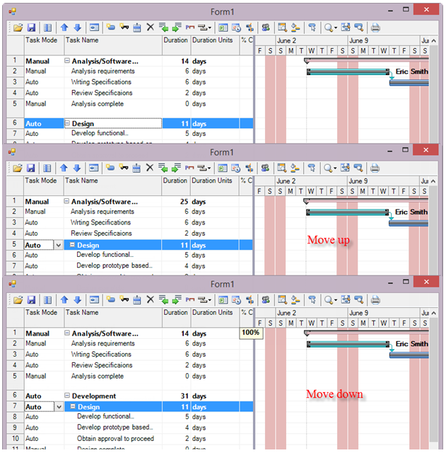 After a task was moved up or down, if moved task is summary task, all its children will be moved also. If the previous/next task before move is summary task, moved task will be adopted as a new child by that task. Otherwise, the old neighbor’s parent will adopted moved task.
