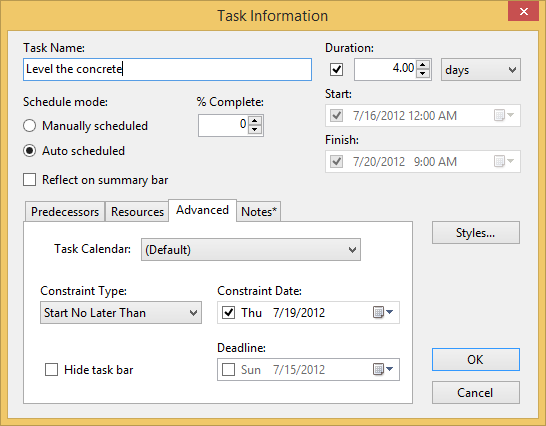 In the Advanced tab you can specify the task calendar, whether or not to hide the selected task bar, and specify a deadline for the selected task. If the task is auto scheduled, you can choose the constraint type and constraint date for the selected task.