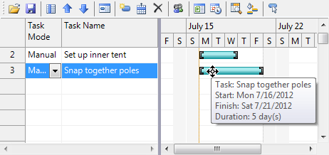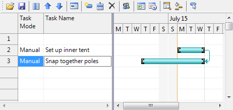 The dependent task, Snap together poles, can start at any time after the Set up inner tent task that it depends on begins. A downward arrow is drawn to illustrate the link between the two tasks.