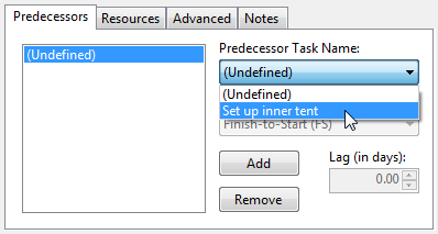 - Click the dropdown arrow from the Predecessor Task Name: and select the predecessor task, for example, Set up inner tent.