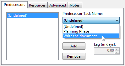 - Click the dropdown arrow from the Predecessor Task Name: and select the predecessor task, for example, Write the document.