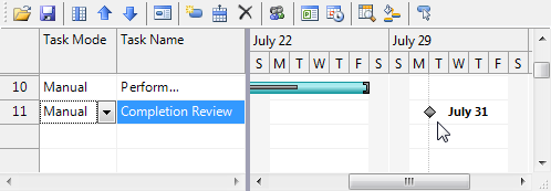 A milestone with a diamond shape and the finish date text to the right of it appears in the chartview area of the ganttview.
