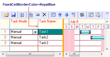 The following C1GanttView illustrates the FixedCellBorderColor modified to RoyalBlue.