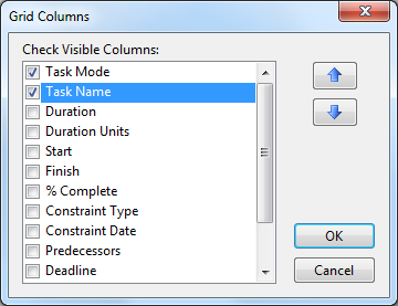 The Grid Columns dialog box is used for specifying which attribute names appear in the columns of the C1GanttView control., The default visible columns are Task Mode and Task Name. Click OK to save and close the changes made to the Grid Columns dialog box.