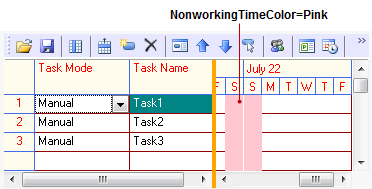 The following C1GanttView illustrates the NonworkingTimeColor property modified to Pink.
