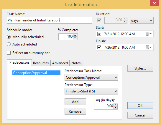 In the Predecessors tab you can add or remove predecessors, select the predecessor task name, select the predecessor type, and specify the lag time in days.