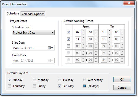 The Project Information dialog box is used for creating and scheduling a new project. The Project Information dialog box consists of a Schedule tab and a Calendar Options tab. The Schedule tab includes Project dates groupbox and a Default working times groupbox.