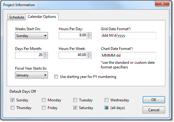 When the Calendar Options tab is selected in the Project Information dialog box, the following items operate as follows: