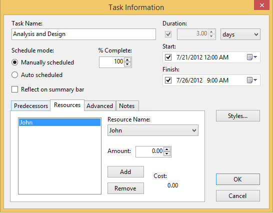 In the Resources tab you can add a resource to the selected task using the Add button or remove a resource from the selected task using the Remove button.