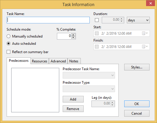 The Task Information dialog box is used for providing the details of the new task such as the task duration, task start date, task finish date, task schedule mode(manual or automatic), task percent completed, predecessor tasks, resource tasks, advanced tasks, and notes for the tasks. Styles for each task can also be modified by clicking on the Styles button.