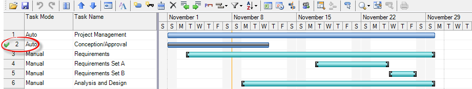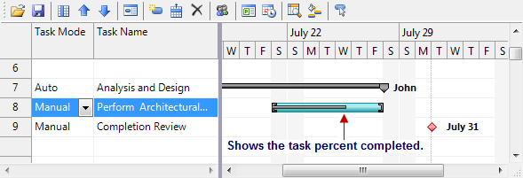 A 100% complete task is represented differently in the C1GanttView control. A task completion indicator appears next to the tasks which are 100% complete, as shown in the image below: