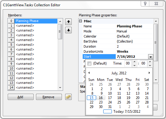 Generally each task has a start and finish time. All projects should have at least a start date. The Start time is specified by the Start property and can be expressed in Date/Time format. For your convenience a dropdown calendar appears when you click on the dropdown arrow next to the Start property at design-time or run-time where you can select the date from the dropdown calendar and set the time format in the increment button. The first increment button expresses the time in hours and the send increment button expresses the time in minutes. For example the start time for the Planning Phase task is set to 6/25/2012 at 8:00 a.m.