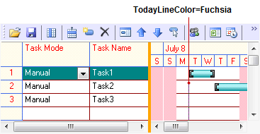 The following C1GanttView illustrates the TodayLineColor property modified to Fuchsia.