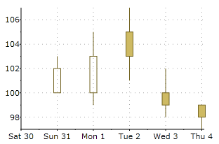 A Candle chart is a special type of HiLoOpenClose chart that is used to show the relationship between the open and close as well as the high and low. Like HiLoOpenClose charts, Candle charts use the same price data (time, high, low, open, and close values) except they include a thick candle-like body that uses the color and size of the body to reveal additional information about the relationship between the open and close values. For example, long transparent candles show buying pressure and long filled candles show selling pressure.
