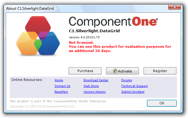 All ComponentOne products are designed to display licensing information at run time if the product is not licensed. None will throw licensing exceptions and prevent applications from running. Each time an unlicensed Silverlight application is run; end-users will see the following pop-up dialog box: