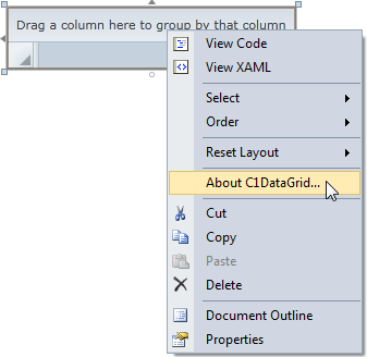 To stop this message from appearing, enter the product's serial number by clicking the Activate button on the About dialog box of any ComponentOne product, if available, or by rerunning the installation and entering the serial number in the licensing dialog box. To open the About dialog box, right-click the control and select the About option: