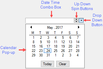 - Date time combo box: DateEdit includes a date time combo box that allows entering date manually as well as inputting a selected date from the calendar pop-up.