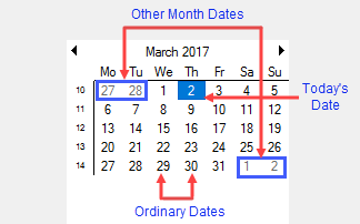 - Other month dates: Indicates the dates that belong to next and previous months, but lie in the same week as that of first or last date of the current month.
