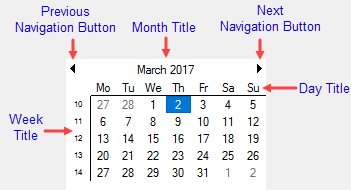 - Navigation buttons: CalendarView consists of Previous and Next navigation buttons that allow you to go to the previous or the next month respectively.