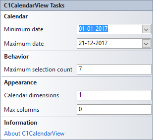 CalendarView and DateEdit provide design-time support to simplify working with their object model. The controls include smart tags to readily access common properties and other options. Smart tag is a short-cut to the C1CalendarView and the C1DateEdit Tasks menu that provide a quick access to common properties of the controls.