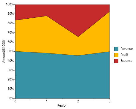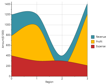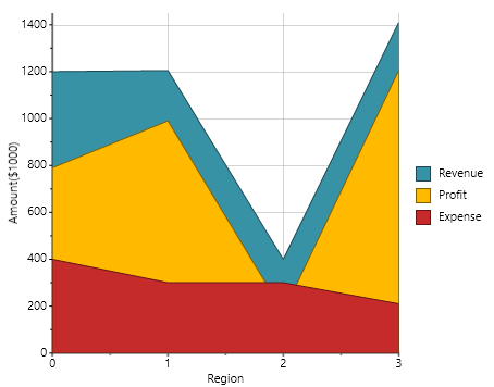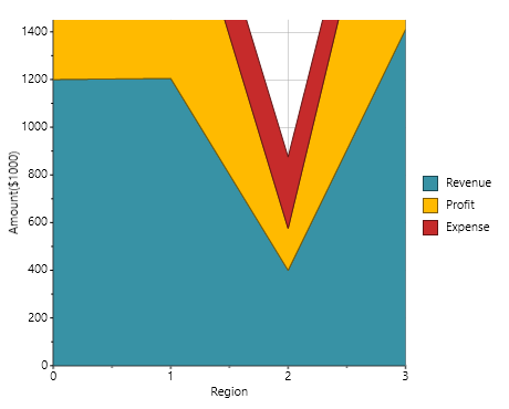 <Chart:C1Chart x:Name="chart0" Height="350" Width="450" ChartType="Area" Palette="Solstice" Foreground="Black" > <!-- Populate the chart with three series --> <Chart:C1Chart.Data> <Chart:ChartData > <Chart:ChartData.Children> <Chart:DataSeries Label="Revenue" Values="1200, 1205, 400, 1410" ></Chart:DataSeries> <Chart:DataSeries Label="Profit" Values="790, 990, 175, 1205" ></Chart:DataSeries> <Chart:DataSeries Label="Expense" Values="400, 300, 300, 210" ></Chart:DataSeries> </Chart:ChartData.Children> </Chart:ChartData> </Chart:C1Chart.Data> <!-- Configure axes --> <Chart:C1Chart.View> <Chart:ChartView> <Chart:ChartView.AxisX> <Chart:Axis Title="Region" Height="35"/> </Chart:ChartView.AxisX> <Chart:ChartView.AxisY> <Chart:Axis Title="Amount($1000)" Min="0" Max="1450" MajorUnit="200" /> </Chart:ChartView.AxisY> </Chart:ChartView> </Chart:C1Chart.View> <Chart:C1ChartLegend Visibility="Visible" Position="Right" /> </Chart:C1Chart> |