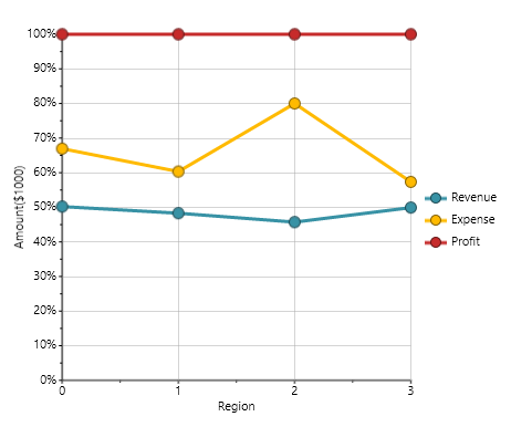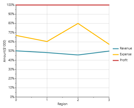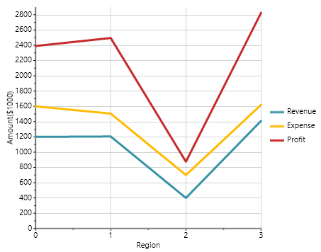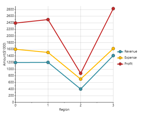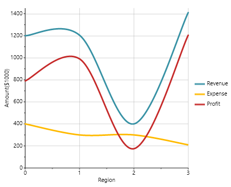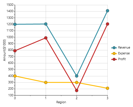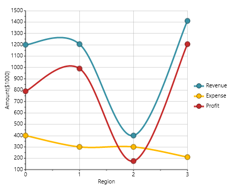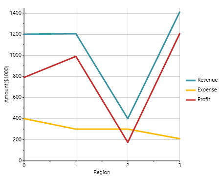 <Chart:C1Chart x:Name="chart0" Height="350" Width="450" ChartType="Line" Palette="Solstice" Foreground="Black" > <!-- Populate the chart with three series --> <Chart:C1Chart.Data> <Chart:ChartData > <Chart:ChartData.Children> <Chart:DataSeries Label="Revenue" Values="1200, 1205, 400, 1410" ></Chart:DataSeries> <Chart:DataSeries Label="Expense" Values="400, 300, 300, 210" ></Chart:DataSeries> <Chart:DataSeries Label="Profit" Values="790, 990, 175, 1205" ></Chart:DataSeries> </Chart:ChartData.Children> </Chart:ChartData> </Chart:C1Chart.Data> <!-- Configure axes --> <Chart:C1Chart.View> <Chart:ChartView> <Chart:ChartView.AxisX> <Chart:Axis Title="Region" Height="35"/> </Chart:ChartView.AxisX> <Chart:ChartView.AxisY> <Chart:Axis Title="Amount($1000)" /> </Chart:ChartView.AxisY> </Chart:ChartView> </Chart:C1Chart.View> <Chart:C1ChartLegend Visibility="Visible" Position="Right" /> </Chart:C1Chart> |