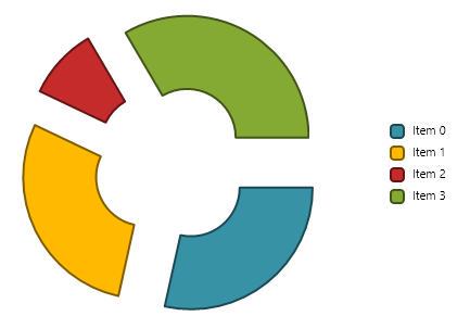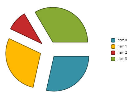 A slice of a Pie chart can be emphasized by exploding it, which extrudes the slice from the rest of the pie. Use the BasePieRenderer.Offset property of the series to set the exploded slice's offset from the center of the pie. The offset is measured as a percentage of the radius of the pie.