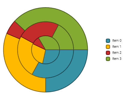 Pie charts have one significant difference when compared to other C1Chart chart types in Pie charts; each series represents one slice of the pie. Therefore, you will never have Pie charts with a single series (they would be just circles). In most cases, Pie charts have multiple series (one per slice) with a single data point in each series. C1Chart represents series with multiple data points as multiple pies within the chart.