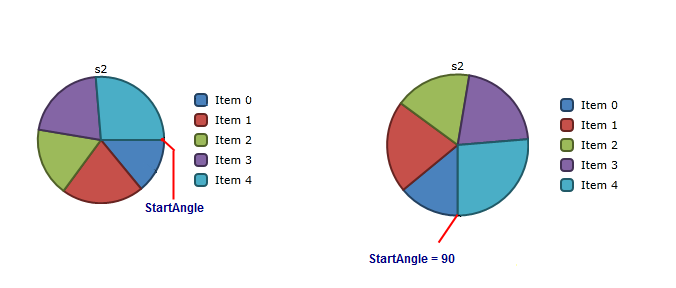 The PieOptions.SetStartingAngle property defines the position of the first slice within the Pie Chart. The first slice always begins at 90 degrees. The Start Angle runs clockwise from the 90 degree angle.