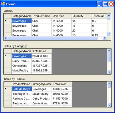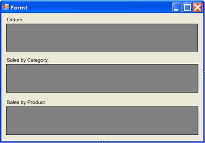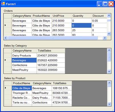To illustrate this, let us create another simple WinForms application using the NorthWind data once again. The application will have three grids. The first corresponds to the ProcessOrder service, allowing users to edit orders. The others correspond to the SalesInformation service, showing sales summaries that are always synchronized with the orders.