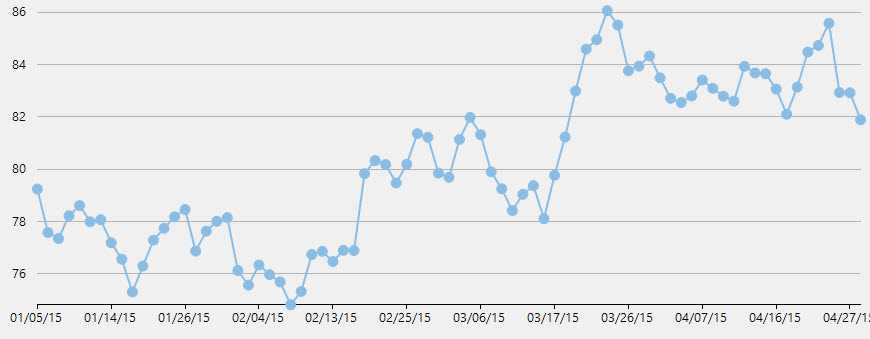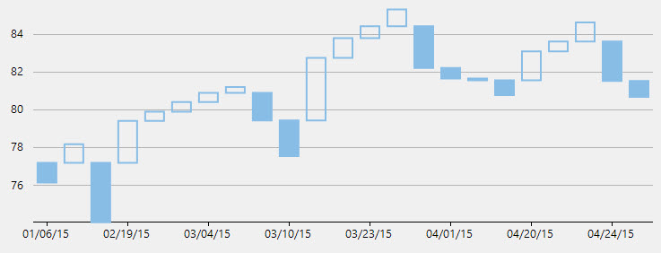 The size of the wick line is determined by the High and Low values, while the size of the bar is determined by the Open and Close values. The bar is displayed using different colors, depending on whether the close value is higher or lower than the open value. The data for this chart type can be defined using the FinancialChart or FinancialSeries binding property as a comma separated value in the following format: "highProperty, lowProperty, openProperty, closeProperty".