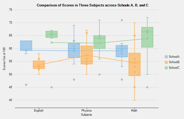 The following image displays quartiles, median, and whiskers for the data that compares scores of students in three subjects across different schools.