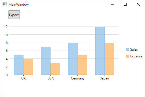 <Grid> <c1:C1FlexChart x:Name="flexChart" BindingX="Country" Height="200" Width="500" ItemsSource="{Binding DataContext.Data}"> <c1:C1FlexChart.Series> <c1:Series SeriesName="Sales" Binding="Sales"/> <c1:Series SeriesName="Expenses" Binding="Expenses"/> </c1:C1FlexChart.Series> </c1:C1FlexChart> <Button Content="Export FlexChart" Height="30" Width="40" Click="OnSaveButtonClick" Margin="0,0,412,269" /> </Grid> |