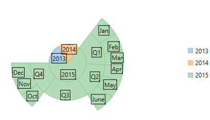 In this step, first create a class DataService that generates random sales data for four quarters, namely Q1, Q2, Q3, and Q4 in 2013, 2014, and 2015. Next, bind Sunburst to the created class using the ItemsSource property provided by the FlexChartBase class. Then, specify numeric values and labels for the Sunburst slices using the Binding and the BindingName property, respectively of the FlexChartBase and the C1FlexPie class.
